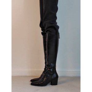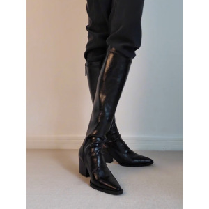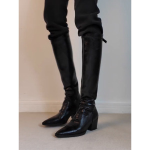羊皮版~真皮粗跟尖头褶皱弹力瘦瘦靴女英伦风高筒靴长筒靴骑士靴