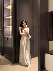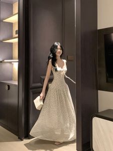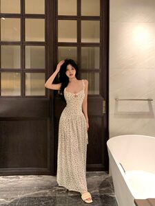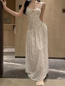 法式气质收腰波点吊带裙连衣裙女夏季海边度假风裙子系带A字长裙