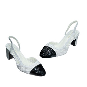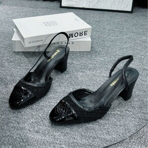 2025秋季新款小香风同款网面刺绣浅口拼色粗跟包头凉鞋女百搭显瘦