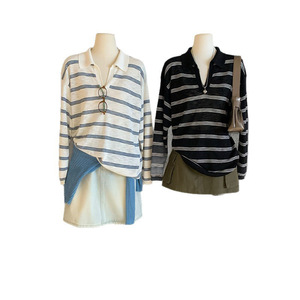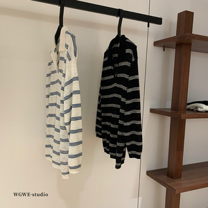 WGWE6855条纹V领微透薄款T恤百搭防晒罩衫翻领上衣