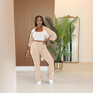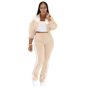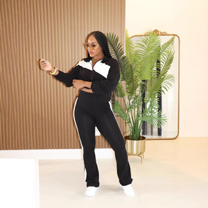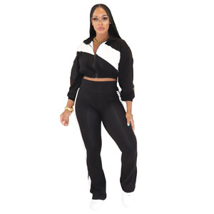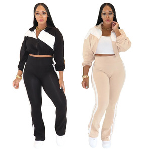 Y1358欧美外贸亚马逊时尚运动休闲撞色拼接套装长袖开衫两件套女