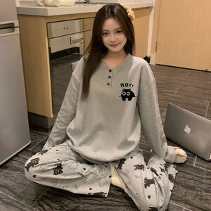 跨境批发纯棉睡衣女款春秋季长袖新款可爱猫咪卡通简约家居服套装