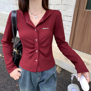 2025正肩不规则连帽领长袖t恤春秋季新款胖mm收腰小众甜美上衣