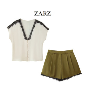 ZARZ 自制 欧美风 新款女装 撞色花边饰丝缎质感衬衫缎面花边短裤