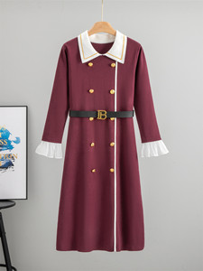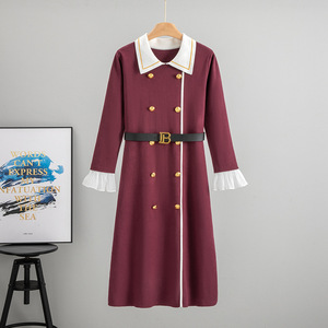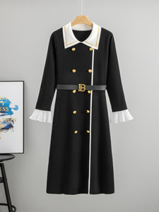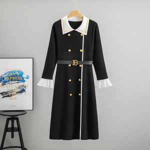 2025年秋季新款翻领英伦风拼接喇叭袖针织中长裙女气质显瘦连衣裙