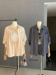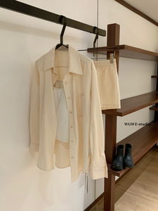 WGWE韩系时尚系扣条纹翻领长袖衬衫+松紧腰休闲短裤两件套装W6895