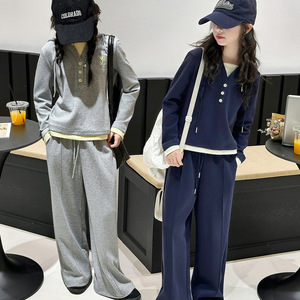 跨境女童套装秋新款2025儿童秋装运动大童时髦假两件卫衣休闲卫裤