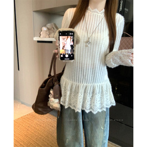 巧克少女杏色坑条蕾丝拼接花边针织衫女秋季弹力宽松休闲长袖上衣