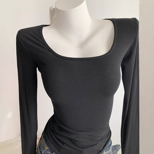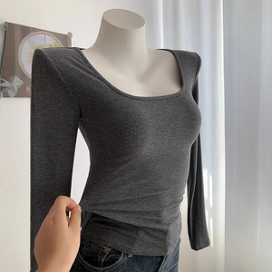 弹力大显身材~瘦瘦打底T长袖方领漏锁骨纯欲修身灰色上衣女
