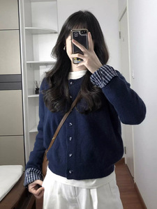 假两件藏蓝色软糯针织开衫春秋季新款韩系慵懒风毛衣外套女上衣