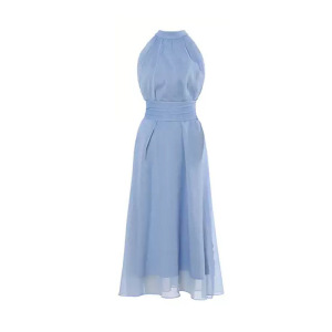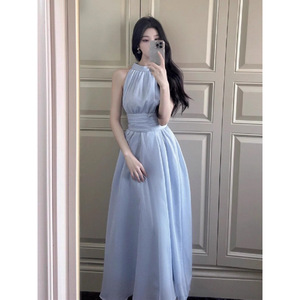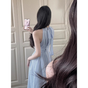 蓝色雪纺连衣裙子长款夏季2025新款女装收腰挂脖沙滩长裙海边度假