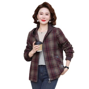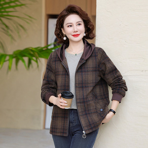 中老年女装时尚妈妈外套连帽秋季新款休闲格子拉链衫洋气奶奶上衣