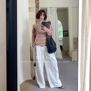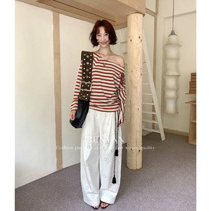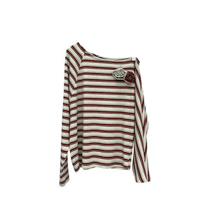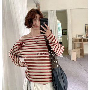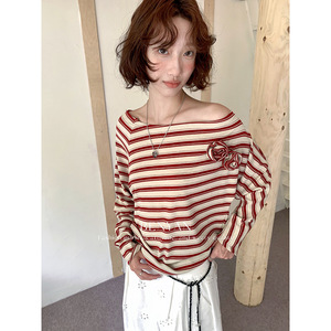 本言 法式甜美风花朵装饰一字领斜肩慵懒宽松条纹长袖T恤女82329