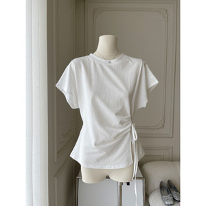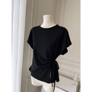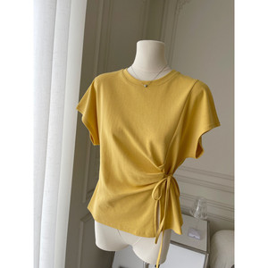 韩式设计款绑腰收腰短袖T恤设计感蝙蝠袖上衣罩衫棉质