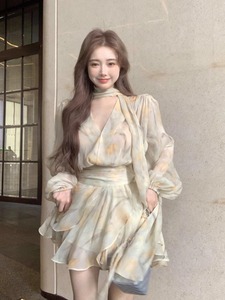 法式碎花v领长袖雪纺连衣裙女秋季温柔风设计感别致收腰a字短裙子