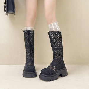 镂空复古百搭粗跟厚底长筒靴女秋季时尚圆头小个子粗跟高跟时装靴