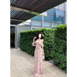 法式茶歇裙木耳边露背收腰碎花连衣裙女夏季温柔风修身一字肩长裙