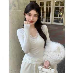 蕾丝V领内搭德绒打底衫女磨毛长袖t恤辣妹修身边上衣