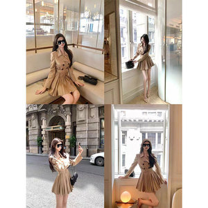 Hotdog热狗很辣 留兰冰咖风衣百褶连衣裙女可当外套