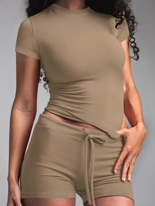 2025跨境爆款纯色优雅两件套圆领短袖和短裤套装瑜伽服健身服女装