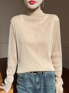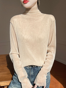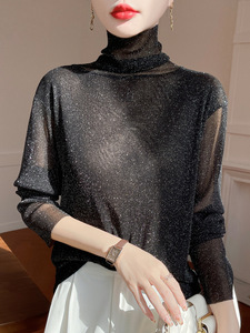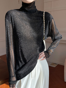 黑色高领打底衫女春秋薄款内搭亮片堆堆领针织衫微透内透网纱上衣