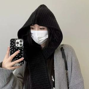 连帽披肩款帽子围巾一体两件套纯色保暖秋冬季两用针织围巾毛线帽