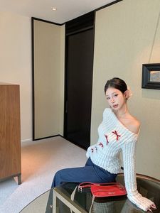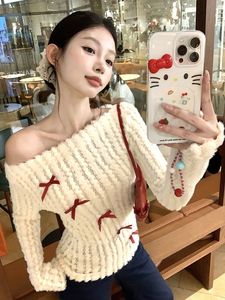 蝴蝶结露肩白色长袖针织衫女秋季修身套头毛衣设计感内搭绝美上衣
