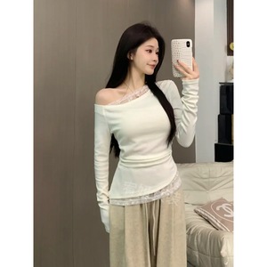 秋季穿搭女蕾丝假两件一字斜露肩长袖T恤修身收腰褶皱打底小上衣