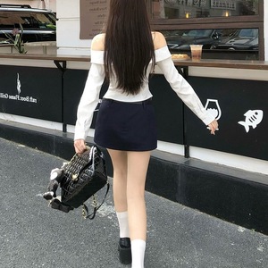 纯欲辣妹蕾丝拼接一字肩上衣女学院风条纹收腰衬衫半身裙两件套秋