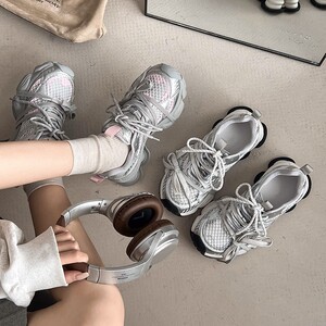 【林允同款】厚底老爹鞋女款2025新款春季网面透气百搭银色运动鞋