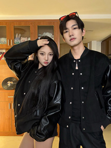 黑色净版棒球服外套男女拼接PU皮高级感2025春秋新款夹克中性风潮