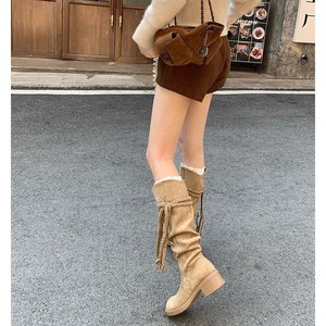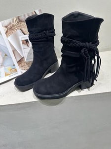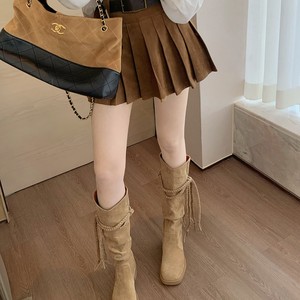 葡萄妈同款现货发~ 增高5.5cm~废土风流苏编织带粗跟堆堆中筒靴女