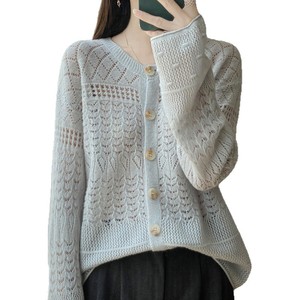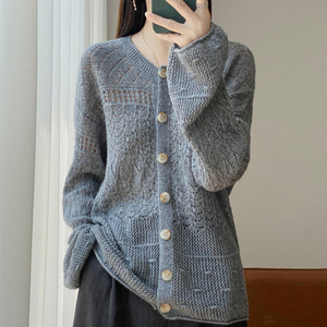 100纯羊毛针织开衫女式圆领手工钩花外套舒适保暖宽松慵懒风毛衣