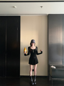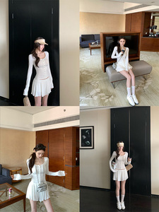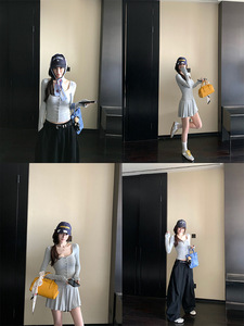 Skk Store 甜氧韩女 复古U领长袖修身打底开衫上衣半身裙套装