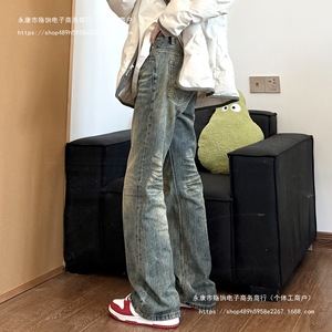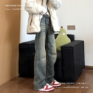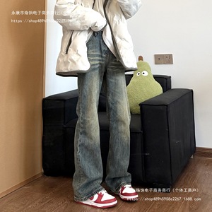 Aolly 春季高街美式复古水洗做旧宽松微微喇牛仔裤 男款裤子