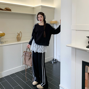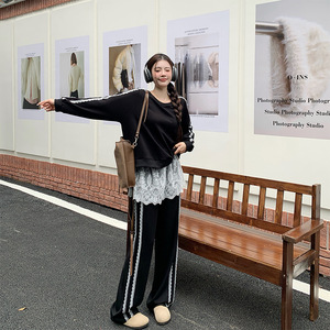秋季新款大码胖MM蕾丝拼接简约时尚显瘦两件套装