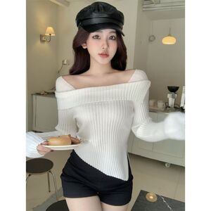 一字肩针织打底衫女春秋冬不规则内搭法式高腰正肩锁骨长袖上衣服