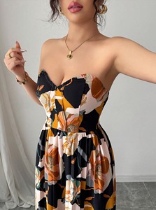 2025欧美外贸印花压褶无袖抹胸长款甜妹节日连衣裙通勤A摆裙伞裙