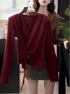 酒红色【韩系氛围感/绝美/温柔风/巨显瘦遮肉/收腰/小个子/长袖上衣女春秋单穿/休闲/松弛感/chi