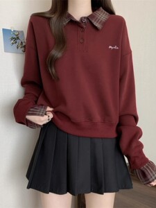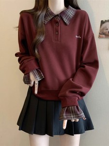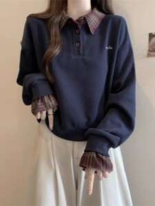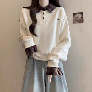 格子衬衫拼接假两件卫衣女款秋冬大码胖mm显瘦宽松韩系Polo领上衣