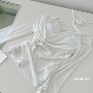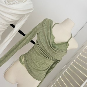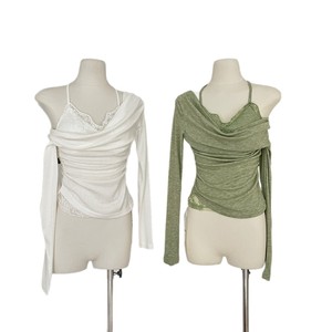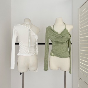 2025秋季新款 纯色假两件斜肩荡领长袖T恤女蕾丝挂脖打底衫上衣