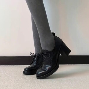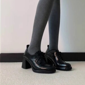 牛皮版~复古气质高跟小皮鞋圆头通勤粗跟单鞋女系带小个子乐福鞋