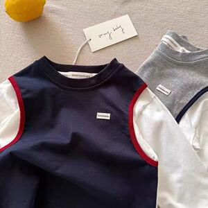 儿童假两件T恤秋季2025新款男女童字母背心学院风宝宝上衣女洋气