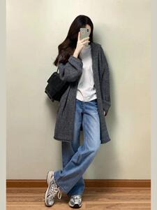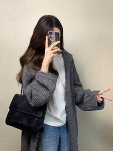 早秋季韩系气质灰色中长款连帽毛衣外套女宽松慵懒松弛感针织开衫
