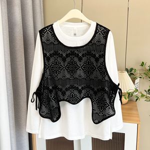 2025大码女秋季新款韩版时尚胖MM蕾丝马甲长袖T恤两件套上衣7883