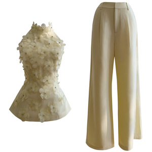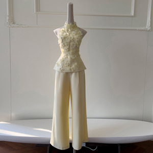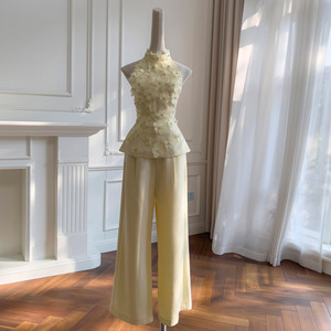 春季欧美优雅复古柔美黄色无袖上衣搭配长裤优雅气质71475+51388