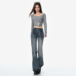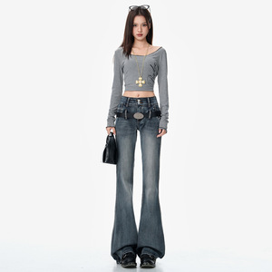 不贴腿设计感印花喇叭牛仔裤女秋季新品新中式辣妹宽松显瘦拖地裤