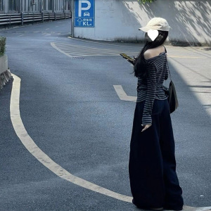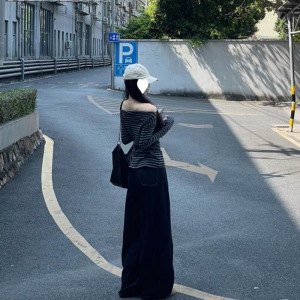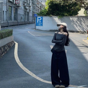 工厂批发直销 韩式慵懒一字肩条纹款长袖T恤女夏季修身斜肩上