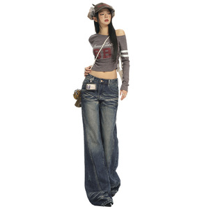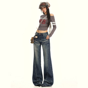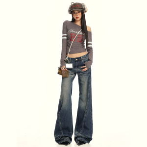 【今茵】秋冬新款美式复古拼接设计感牛仔裤百搭显瘦宽松微喇裤女