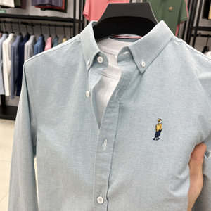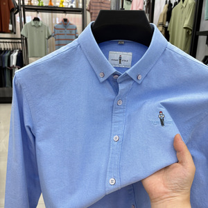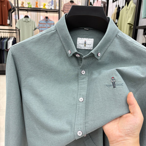 新款100%纯棉男士衬衫长袖秋季中年翻领刺绣纯色高级感衬衣男批发